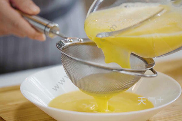 2.鸡蛋磕开放入盐打散,加入适量温水,打匀过筛去掉未打散的蛋液泡沫。