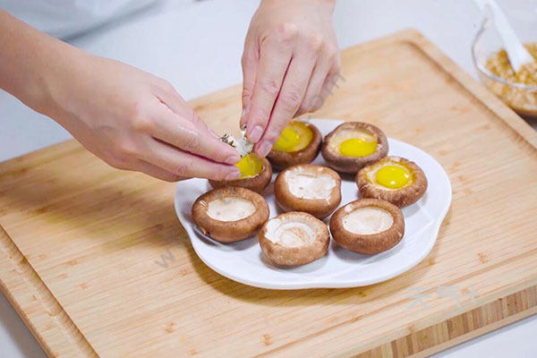 1.首先把小葱和香菇切好,每个香菇上打入1个鹌鹑蛋。