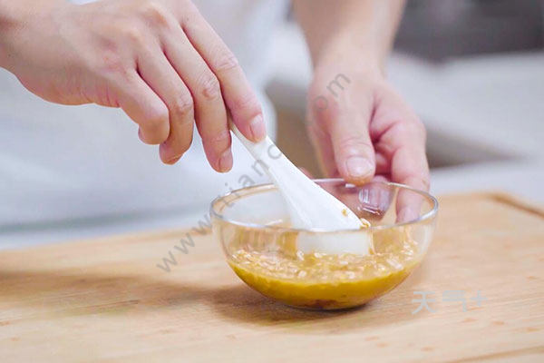 3.碗中放入剁碎的香菇蒂,加入蚝油、生抽,清水、水淀粉并调成酱汁。