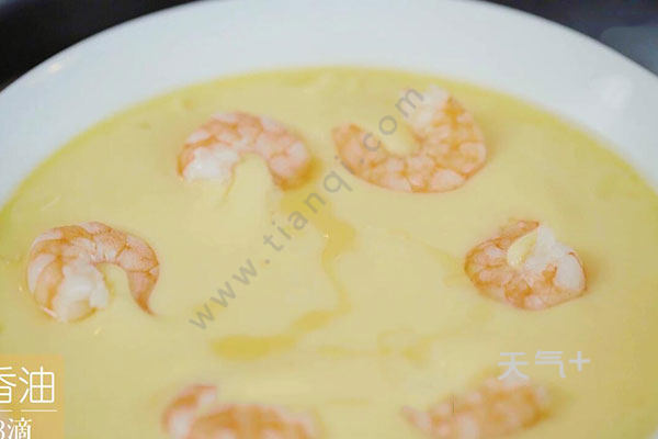 4.10分钟后端出取掉保鲜膜,放入虾仁继续蒸5分钟,淋上几滴香油后即可出锅。