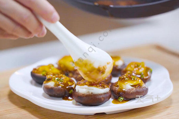 4.在锅中倒入油和酱汁,煮至汤汁收浓,将熬好的酱汁淋在香菇上即可。