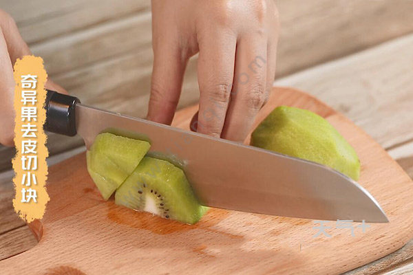 2.再把奇异果去皮切小块,草莓切成四等份;
