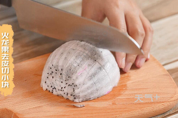 1.首先把火龙果去皮切小块,放入盘中;