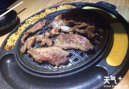 这是一家铁壁子烤肉,桌子上一个圆烤盘,周围是空心的,里面装了鸡蛋液、酸菜、玉米粒跟着一起烤,烤肉味道还是可以的。黑胡椒牛肉和香肠,香煎多宝鱼味道比较不错,梅花肉味道也可以,可惜主食的种类并不多,烤肉味道还是可以的。
