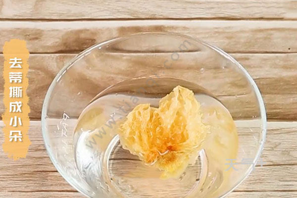 1.先将银耳放入温水中浸泡30分钟,然后去蒂撕成小朵;