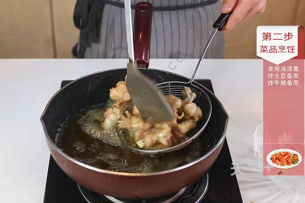2.锅中放入适量油,油温烧至7成热,放入土豆炸至微焦,捞出待用,腌好的牛蛙裹上淀粉。放入锅中炸至微焦,捞出待用;