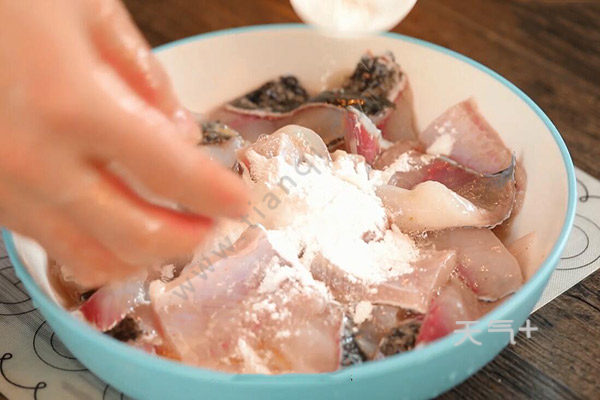 2.黑鱼切开对半后再取它的侧身肉,并将肉切块或切片,放入碗中加入一些孜然粉、蛋液和少许油,用手捏至均匀,倒入一些芡粉再揉捏。