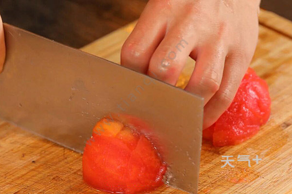 1.首先将葱切成葱花,大葱切段,姜和野山椒切块,再把蒜和红辣椒切块,将番茄的外皮拨开,然后切成番茄块。