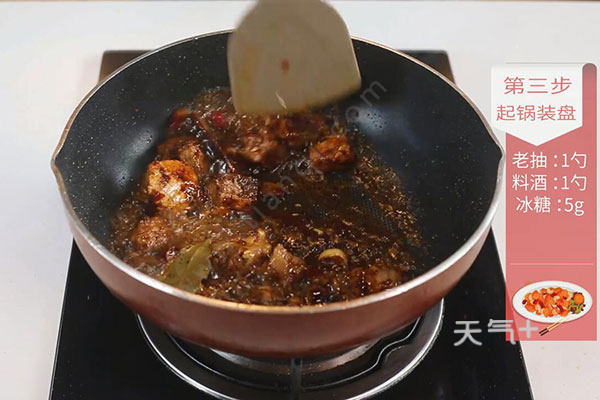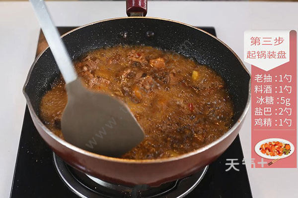 3.锅内放入适量油,油温烧至七成热,放入切好的姜片、蒜粒、花椒、豆瓣酱炒出红油,放入排骨煸炒干,放入干辣椒段、八角2个、香叶1片、桂皮1块、茴香1克、老抽1勺、料酒1勺、冰糖5克翻炒均匀;