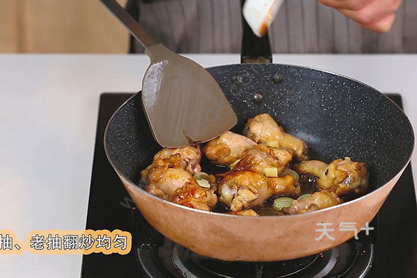 3.油温烧至4成热,放入冰糖小火熬制成棕红色,放入鸡翅根翻炒上色。放入葱姜片、生抽1勺、料酒1勺、老抽3克翻炒均匀。