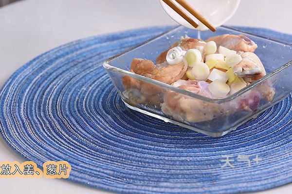 1.大葱切片,姜切片,鸡翅根洗净,放入姜、葱片、料酒1勺腌制半小时。