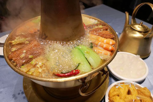 大同铜火锅是地道的山西美食,传统风味,是一种很有特色的高档锅子菜。锅具很有地方特色,中间是排气口,点满炭火,铜锅内堆叠各种各样的食材,不同的口味,其中最受欢迎的就是什锦火锅,菜品的种类比较多,一般有炸丸子、干豆角、扒肉条、干葫芦条、干香菇等等。