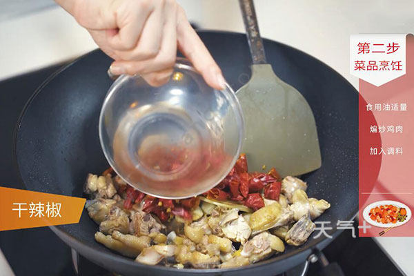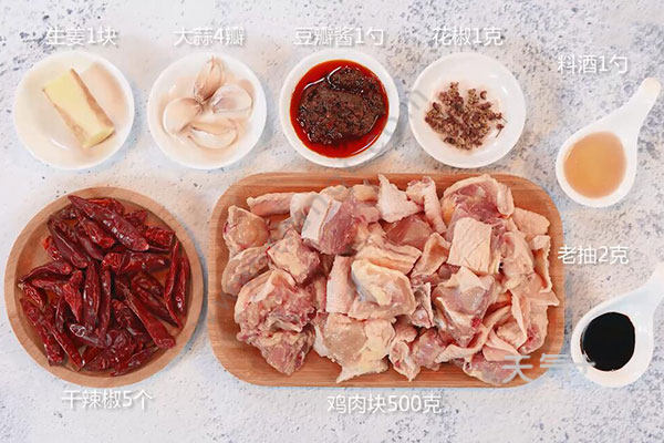 鸡肉块500克,姜1块,蒜4瓣,干辣椒5个,花椒1克;