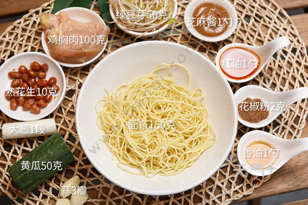 鸡胸肉100克,面条150克,黄瓜50克,绿豆芽50克;