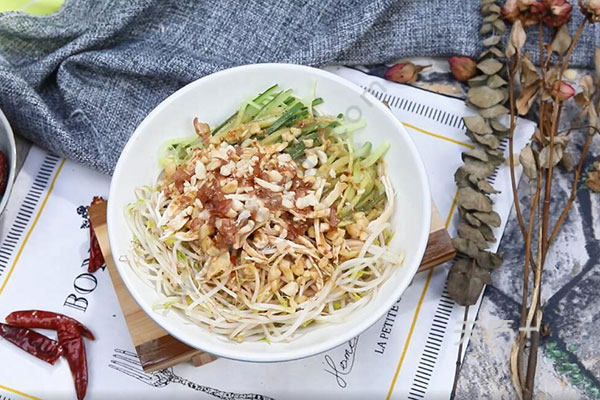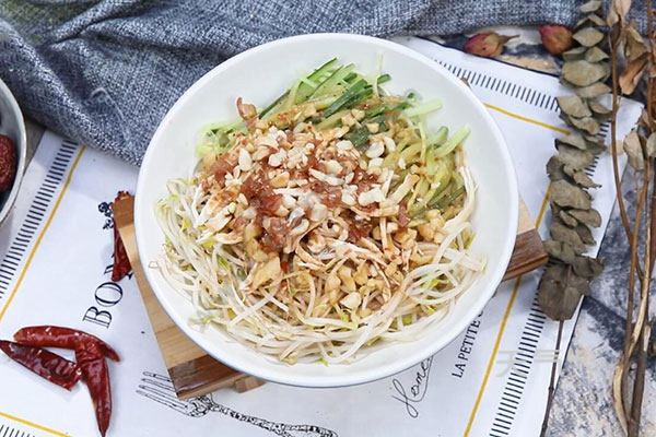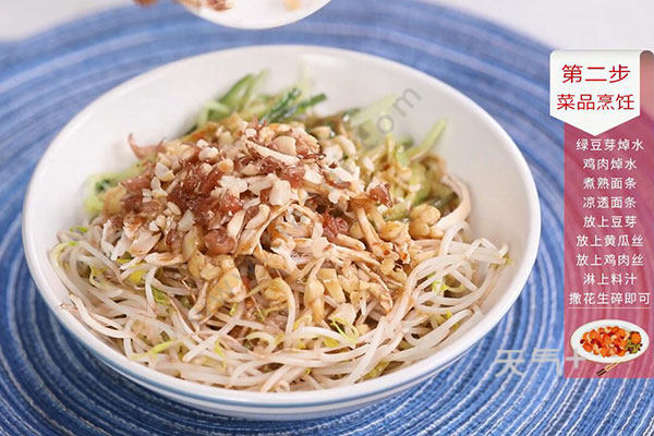 花生捣碎,黄瓜切丝,大葱切丝,蒜切末,绿豆芽焯水20秒捞出,放鸡肉煮至熟透捞出,另煮一锅水,放面条煮至断生,捞出加香油拌匀,放豆芽、黄瓜丝、鸡肉丝,放入蒜末、红油、醋、花椒粉、鸡精、盐、生抽、芝麻酱、凉水拌匀,淋在凉面上,撒上花生碎即可。