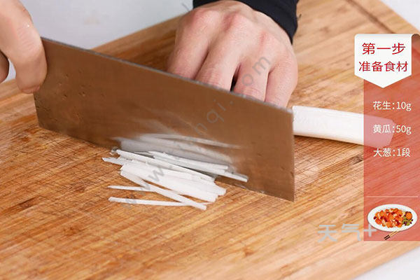1.花生捣碎,黄瓜切片后改刀切丝,大葱切丝,蒜切末;