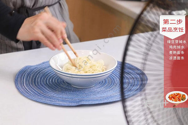 3.另煮一锅水,放入面条煮至断生,捞出加入香油1勺拌匀,并用风扇吹至完全凉透;