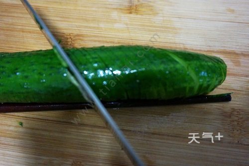 3.很多人可能会说,切蓑衣黄瓜要用两根筷子,其实一根筷子也可以,只是黄瓜要特别顺直,不能有一点点弯度。