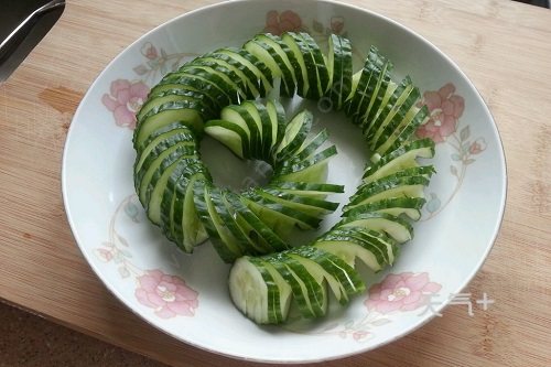 9、此时把黄瓜180度翻转,没有切断的这面向上,拉开看看,像拉花一样,绝不会断,刀刀均匀;