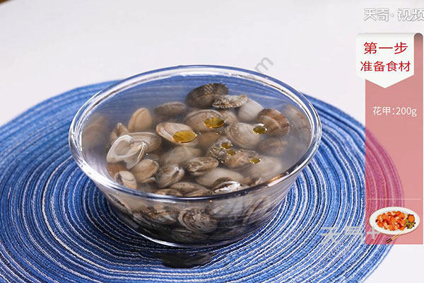 1.花甲放入大碗中,加入适量清水,盐2勺,香油几滴,浸泡1小时,让花甲吐尽泥沙。