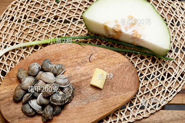 花甲放碗中,加清水、盐、香油浸泡1小时,冬瓜去皮切片,姜切片,小葱切葱花,锅中放姜片、料酒、清水煮沸,放冬瓜片煮5分钟 ,放花甲煮至开口,加盐、鸡精拌匀撒上葱花即可。