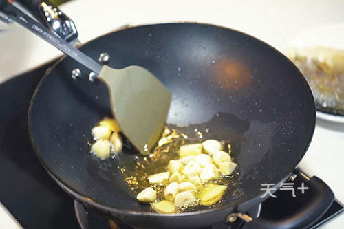 4.锅中留底油,放入蒜粒、姜片爆香;