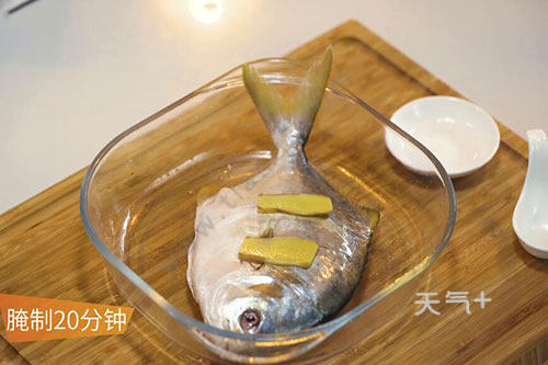 1.蒜切粒,姜1块切片,鲳鱼洗净,在鱼身两面划2刀,放入盐半勺、料酒1勺、姜片拌匀后腌制20分钟;
