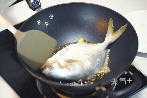 3.锅内放入适量油,油温烧至6成热,放入鲳鱼,小火将鱼身2面煎至金黄,蒜香鲳鱼的做法 鲳鱼怎么做好吃盛出待用;