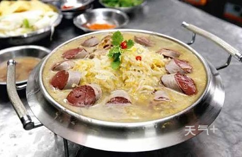 东北农村杀猪之后,都会吃的一道菜,也是本溪满族人的特色菜肴之一,白肉是满族人的传统美食,指的是用白水煮的带肥膘的猪肉,早年满族祭祀都会吃的,将白肉切成片,然后与血肠、酸菜、粉条等下锅煮熟,吃的时候蘸上酱料,口感肥而不腻,香嫩可口。