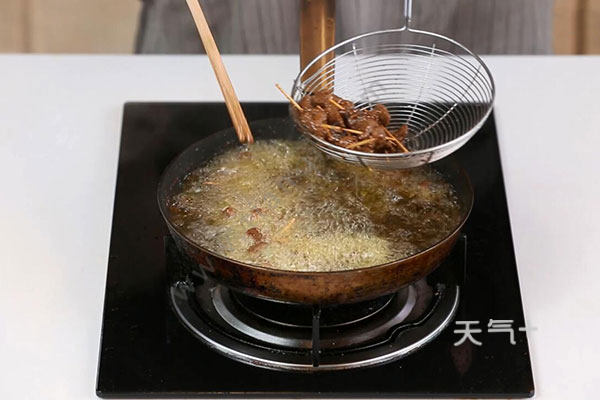 3.油温7成热,放入牙签牛肉炸10秒钟,捞出沥干。