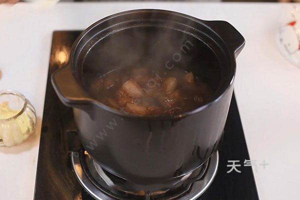 3.然后倒入炖锅中闷煮半个小时,加入土豆,放入鸡精、葱花即可。