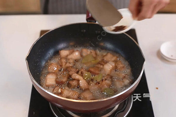 2.锅中加入少量油并烧至七成热,放入五花肉块大火煸炒至微焦,然后放入生抽料酒,姜蒜、香叶以及冰糖,加入清水、老抽后用大火煮;