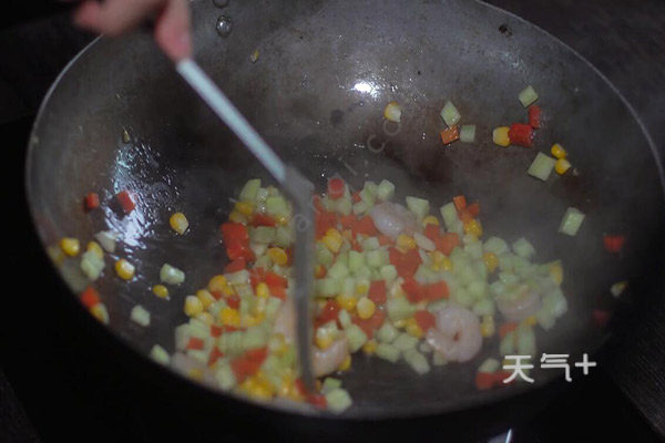 3.炒锅油温烧至6成热,炒香蒜、姜,倒入虾仁爆炒,加入玉米、黄瓜、胡萝卜炒至段生,调入盐、鸡精炒匀,勾芡即可装盘。