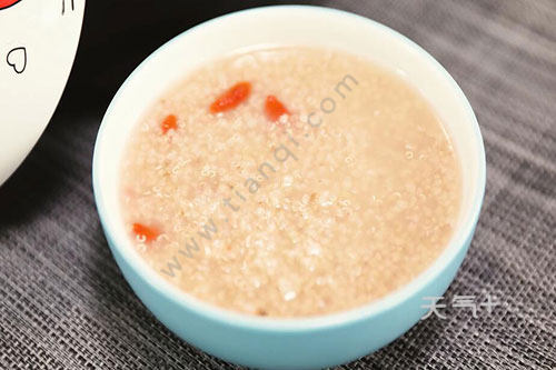 将藜麦、小米、枸杞洗净,锅中放清水,大火烧开,放藜麦、小米煮开,然后转小火熬煮30分钟,期间不定时搅拌,最后放入枸杞,继续熬煮5分钟即可。