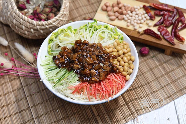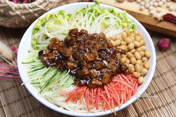 4.锅中倒入适量清水烧开,放入面条煮熟,捞出过冰水。盛入碗中,依次码入黄瓜丝、胡萝卜丝、黄豆、黄豆芽,中间浇上炸酱即可。