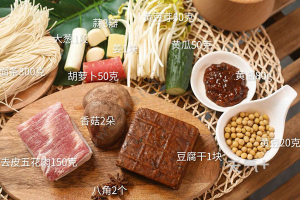 去皮五花肉150克,面条300克,豆腐干1块,黄瓜50克,黄豆20克,黄豆芽50克,胡萝卜50克,香菇2朵;