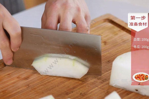 1.白菜洗净,切段,冬瓜洗净,切厚块。姜1块切片,小葱2根切葱花;