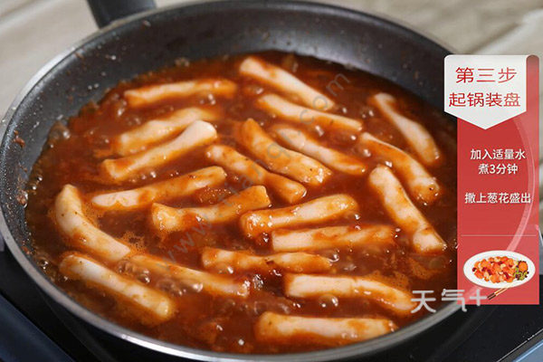3.倒入番茄酱、年糕拌均匀,煮3分钟,加入盐2g,鸡精1g盛出撒上葱花点缀。