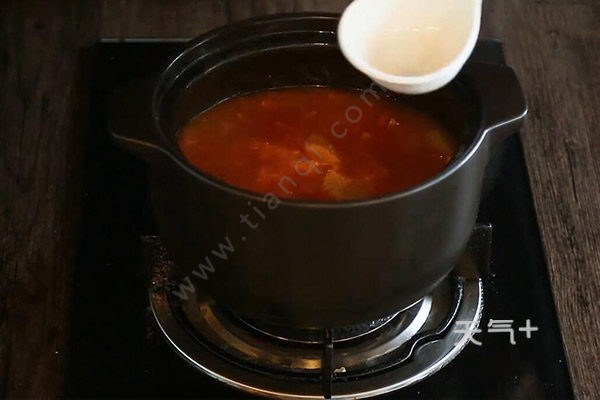 3.锅中放入黄油,放入番茄炒至软烂后加入番茄酱1勺炒匀,加入清水适量煮开,倒入砂锅小火炖1小时,加入牛奶150克、盐1勺、白糖半勺、胡椒粉2克拌匀煮10分钟即可。