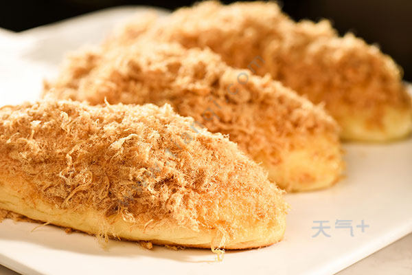 10.把烤盘移往烤箱的上一层,再用急火烤3分钟取出,撒上肉松即可。