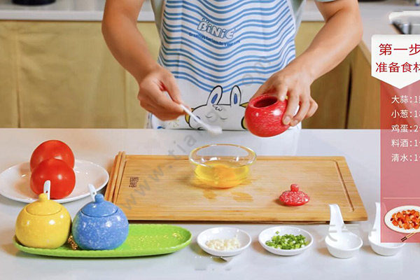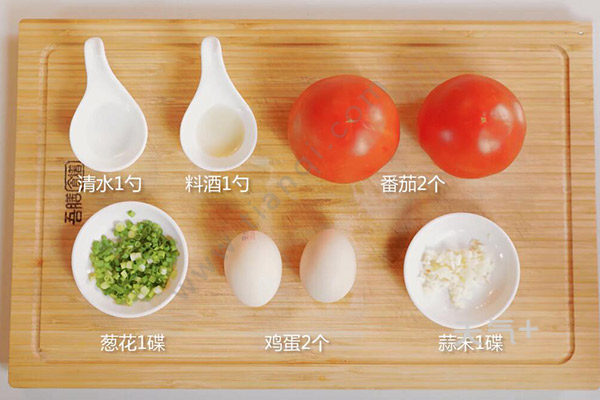 番茄2个,鸡蛋2个,蒜末1碟,葱花1碟,清水1勺,料酒1勺
