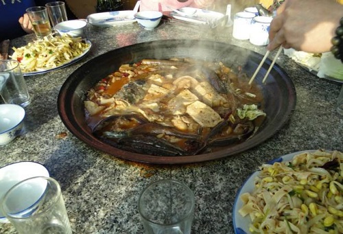这是一家以铁锅炖鱼为主打的东北菜馆,来到店里就能感受到浓浓的东北风味,人很多,环境也不错,据说这家店在辽阳是排名第一的铁锅炖鱼店。来到这里一定要吃的就是这家的铁锅炖,配菜丰富,有大白菜,宽粉,豆腐,茄子等等,还有现烙的大饼,味道很正宗,分量也很足。