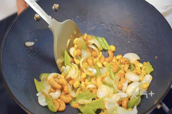 西芹切块,百合洗净剥开,蒜切片,油温烧至6成热,放腰果小火慢煎,表面金黄后盛出,留底油,放蒜片爆香,放西芹、玉米粒、百合炒至断生,加腰果炒匀,放盐翻炒均匀即可出锅。