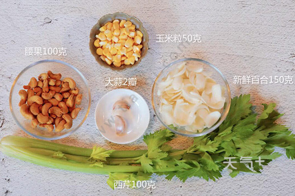 西芹100克,新鲜百合150克、玉米粒50克、腰果100克、蒜2瓣