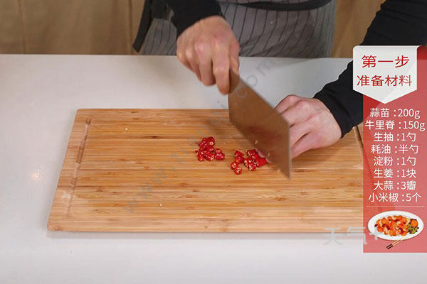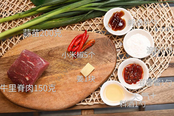 蒜苗200克,牛里脊肉150克;