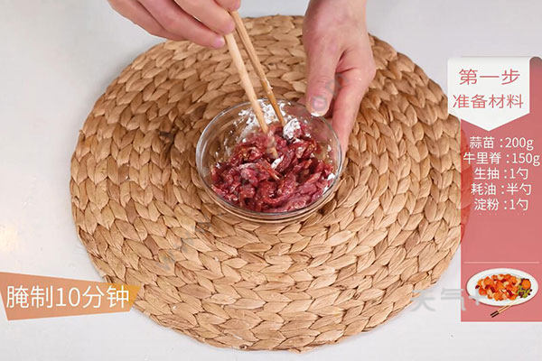 1.蒜苗洗净切段,牛里脊切丝,放入生抽1勺、蚝油半勺、淀粉1勺拌匀腌制10分钟;