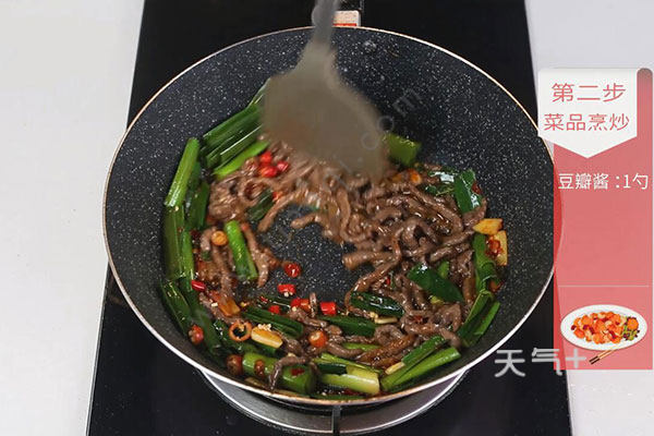 4.锅中留底油,放入姜蒜片、豆瓣酱1勺炒香,放入蒜苗炒至断生,放入牛肉丝、小米椒炒匀;