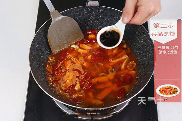 3.油温烧至6成热,放入姜葱蒜、泡姜、泡姜、花椒、豆瓣酱1勺炒匀,加入适量清水、生抽1勺、老抽半勺、白糖1勺大火煮开。
