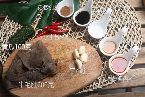 黄瓜切丝,毛肚洗净切丝,蒜切,毛肚焯水1分钟捞出,放在黄瓜丝,碗中放蒜末、小米椒、生抽、醋、香油、盐、鸡精、白糖、花椒粉、辣椒油拌匀,淋在毛肚上即可。