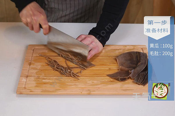 1.黄瓜洗净切丝,铺在盘中。毛肚洗净切丝。凉拌毛肚的做法 毛肚怎么凉拌蒜切末,小米椒切圈,香菜切段;